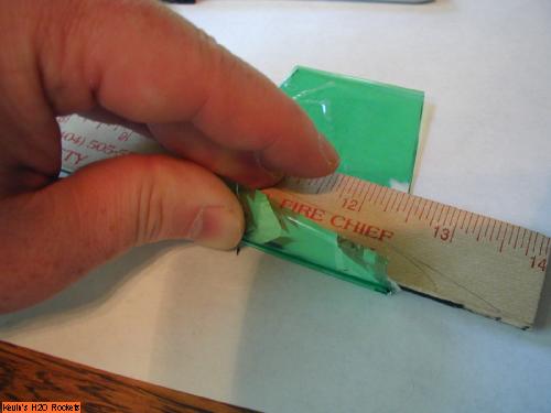 We're now going to use pieces of the packaging tape to tape the leading and trailing edges of the fin. The ruler helps use get a good crease of the plastic and keep the edges together as we're taping. |